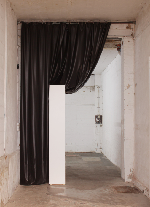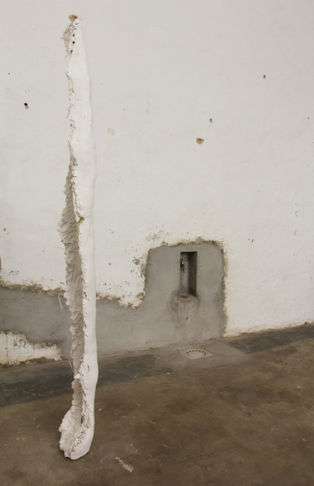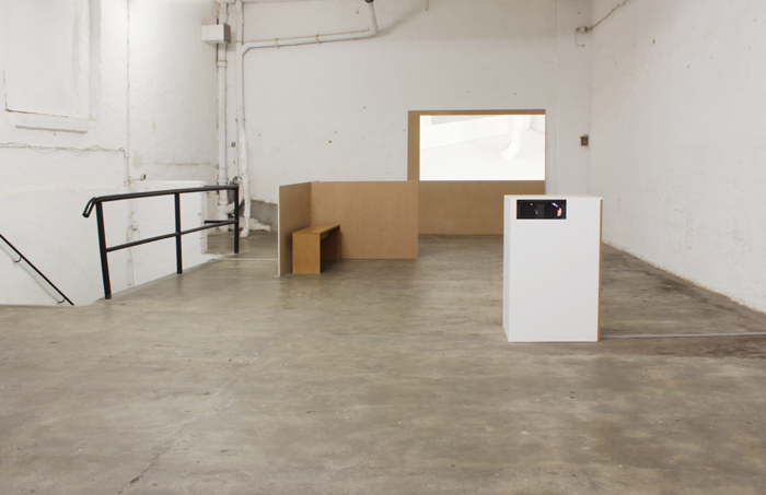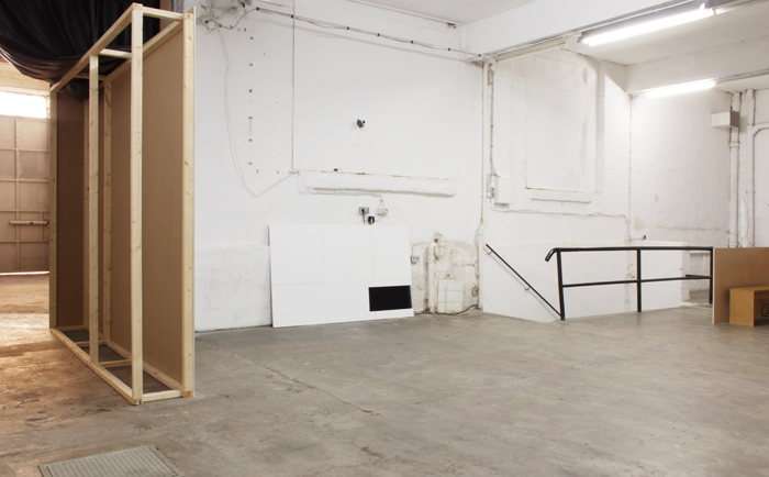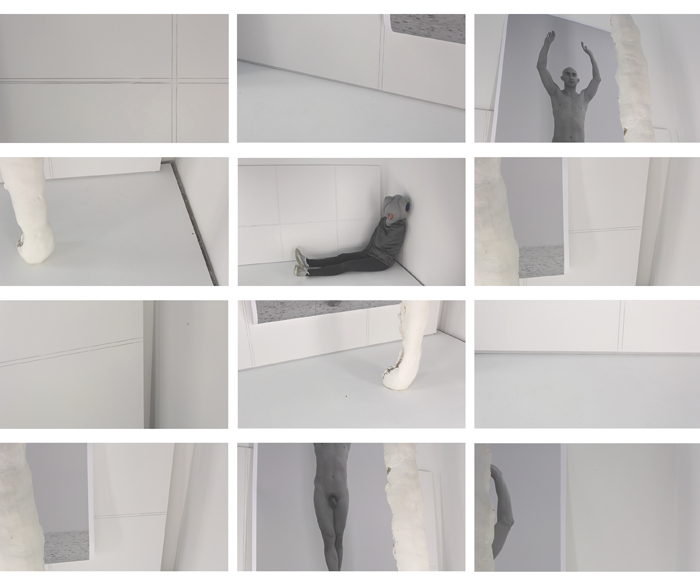 Den schweren Ledervorhang vom SFAR hält einladend ein in den Raum gestelltes Wandpanel beiseite, das die "Bühne" der Ausstellung linkerseits öffnet. Die Rückseite zeigt die offene Baukonstruktion aus MDF-Platten und verweist so auf ihr konkretes Gemacht-sein (ein Element, was in der Ausstellung immer wieder zu sehen ist). Die Vorderseite zeigt sich als geweißte Wand, die die feine quadratische Maserung des SFAR Tores aufweist. Etwa mittig im Raum gestellt, befindet sich eine Bank für den Autor dieser Zeilen, die von zwei etwa hüfthohen Wänden gerahmt wird. Auch hier zeigt sich der Gegensatz zwischen Weiß bearbeiteter und unbearbeiteter Wandseite. In der hinter Ecke des Raumes platziert, befindet eine Art Stele aus Gips. Die Rückseite der Stele zeigt sich als hohles Halbrund, welches das Drahtgestell der Skulptur offenlegt. Die Höhe bemisst sich an der Körpergröße der Künstlerin, wodurch die abstrakte Säule etwas konkret körperliches erhält. Das Reinszenieren eigener Werke ist ein Element in Monkas Ausstellungen, was hier ganz präsent gemacht wurde. Ein auf eine an die Wand angelehnte Holzplatte projiziertes Video zeigt Ausschnitte und Close-Ups eben dieser Elemente der Ausstellung. Die Wandpanele und die Skulptur werden hierbei aus verschiedenen Winkeln gezeigt. Beizeiten sieht man das Foto eines nackten Mannes in tänzerische Pose, der die aufstrebende Form der Skulptur aufzunehmen meint. Das Video zeigt dabei keine Situation im SFAR, sondern eine Aufnahme in ihrem Studio, in dem sie die Objekte "künstlich" miteinander kombinierte, um sie wiederum hier in die Ausstellung zu holen. Das Körperhafte oder seine Anspielung daran (das Video zeigt unter anderem das Foto eines schwarzen Objektes (was sich als Butt-Plug herausstellt) sowie die Künstlerin selbst) bilden einen Gegensatz zu den klaren architektonischen Baustrukturen der Ausstellung. Vor allem das Aktfoto meint eine kompensatorische Funktion einer der Ausstellung fehlenden "Sinnlichkeit" zu erfüllen.