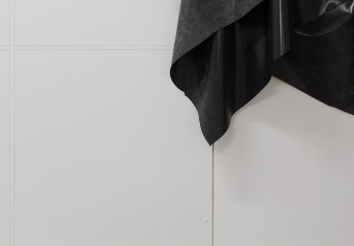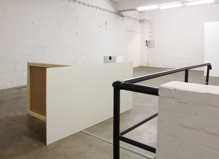 Dieser ´Gefahr´ einer ästhetischen Abstumpfung - man könnte es konzeptuellen Entgrenzung nennen - antwortet Monka mit der Verwendung körperlicher Elemente, die als konkreter Gegensatz zur Architektur zu sehen sind. Waren es in vorherigen Ausstellung Körperabdrücke, die sich in ihren Wandarbeiten befanden, so sind es hier unter anderem das Akt-Foto, die Gips-Skulptur aber nicht zuletzt auch die Präsenz des Autors, die der sachliche Strenge der Wandobjekte gegenüber gestellt werden. Doch gleichwohl es sich um architektonische Elemente handelt, sprechen auch sie die Sprache des Exponiert-Seins und heben ihr Dasein auf eine körperlich-empfindsame Ebene. Sie zeigen ihr Inneres, ihr Gemacht-Sein, welches hinter dem ´sleeken´ weißen Wandanstrich die MDF-Teile offenbart. Das Ausgestellt-sein auszustellen ist somit grundlegendes gestalterisches Prinzip von A00116 (ähnlich die offensichtliche Positionierung des Autors).