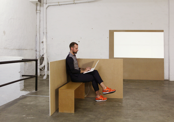Um das Verhältnis von künstlerischer Arbeit und Text zu untersuchen, habe ich den Kunsthistoriker Jonas Schenk eingeladen, Teil meiner Ausstellung A00116 im Studio for Artistic Research zu werden. Während der Öffnungszeiten saß Schenk mit seinem Laptop in einem Setting bestehend aus Objekten, Konstruktionen und einer Videoprojektion und schrieb einen Text über die Ausstellung, während die anwesenden BesucherInnen die Entstehung des Texts auf einem Bildschirm live verfolgen konnten. Ich habe den Versuch unternommen, eine Situation herzustellen, die den Abgleich von physischem Objekt, Abbild und Text erlaubt.