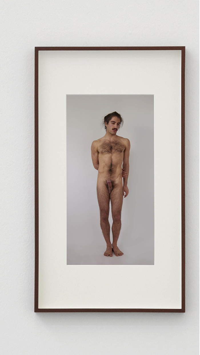 The photographed nude, in the restrained play of forces between limbs, torso and head, adopts the pose of a classical sculpture. But this is not some stern figure made of bronze or marble that is filled with the movement of such inner equilibrium. It is a living male body that is forced to constrain itself into the calm pose of a standing nude for the moment it is photographed. The nude generates two kinds of gaze. The retracing of the sculptural and internally balanced physique is suddenly – and repeatedly – nullified by the very different perception triggered by the photo, the photo of a naked man, his hairiness, his individuality and his erect genital.