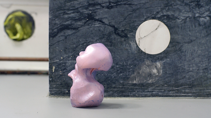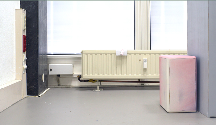 InH00118Steven / 2018 / installation shot: MDF, plaster, paint, sandpaper, tape, architecture of the exhibition space (Flexzone), corresponding person