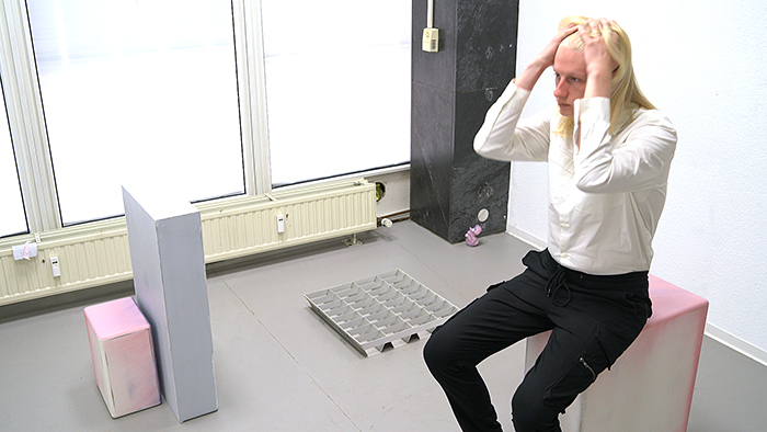 InH00118Steven is a performative sculpture which consist of a sculptural intervention and one accompanying person. The dimensions and the material of the sculptural intervention is based on the body and outfit of the corresponding protagonist. The protagonist repeats one action over and over, as if he were set on loop. The protagonist is running his fingers through his hair constantly. Both the person and the action become part of the sculpture. These actions are performed incidentally and the protagonist is free to talk with the spectators if they want.